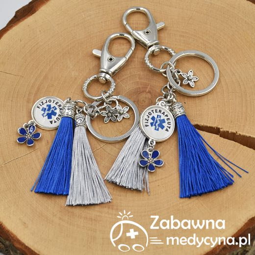 Brelok z wypukłą zawieszką z eskulapem i napisem FIZJOTERAPEUTA, zawieszkami kwiatków oraz niebieskim frędzlem - chwostem. Posiada duży karabinek, dzięki któremu możemy łatwo przymocować brelok np. do torebki czy plecaka, a także mocne kółko do przymocowania kluczy. Taki brelok może być dobrym rozwiązaniem do oznaczenia swoich kluczy. Fajny pomysł na upominek dla fizjoterapeuty. :)