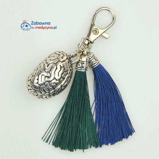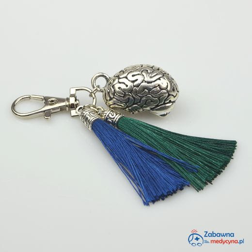 Brelok z zawieszką w kształcie ludzkiego mózgu oraz dwoma frędzlami - chwostami, w kolorze granatu i zieleni. Posiada karabińczyk, dzięki któremu możemy łatwo przymocować brelok np. do kluczy, torebki czy plecaka. Taki brelok może być dobrym rozwiązaniem do oznaczenia swoich kluczy.