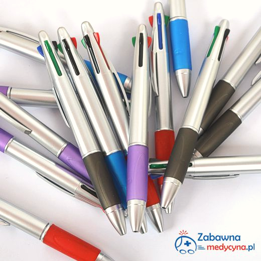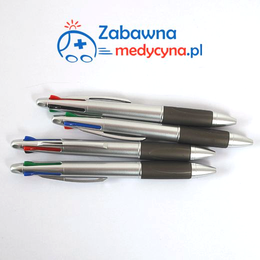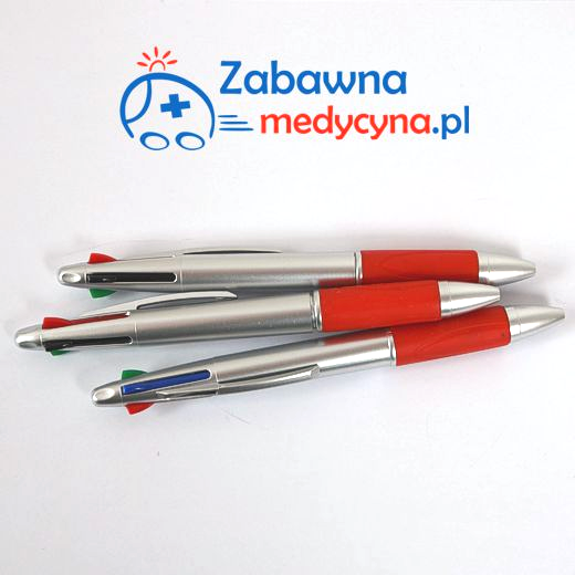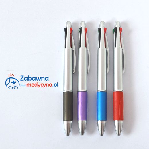 Długopis z 4 kolorami wkładu (czerwony, niebieski, czarny i zielony).