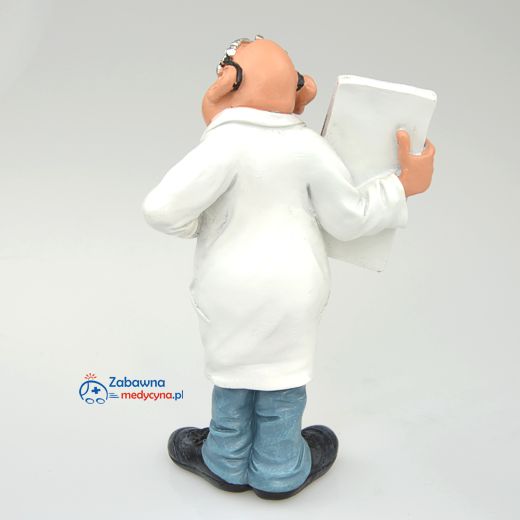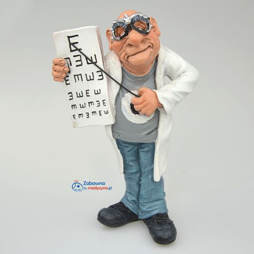 Figurka przedstawiająca okulistę w fartuchu z tablicą okulistyczną. Figurka świetnie sprawdzi się jako prezent dla lekarza, jako podziękowanie, lub upominek z okazji odejścia na emeryturę :) Bardzo starannie i szczegółowo wykonana, ozdobi każde wnętrze.