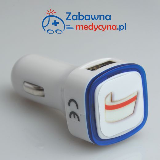 Ładowarka samochodowa z motywem czepka położniczego. Adapter do zapalniczki samochodowej z dwoma gniazdami USB. Posiada podświetlenie w dwóch wariantach kolorystycznych: niebieskim i czerwonym. Wyjście 1.5A. W dzisiejszych czasach, kiedy bardzo często korzystamy z telefonu jest to bardzo przydatny gadżet. Nie zaskoczy nas już rozładowana bateria.