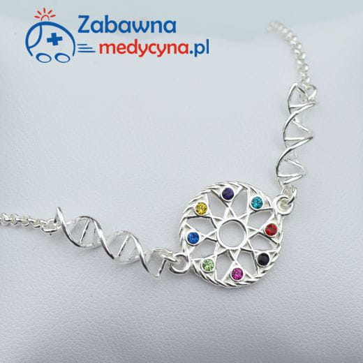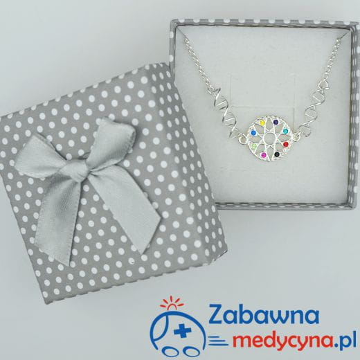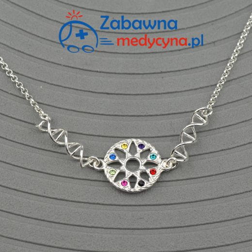 Elegancki i efektowny naszyjnik dla medyków z dwiema spiralami DNA oraz piękną rozetą z kolorowymi kryształkami. W całości wykonany ze srebra próby 925. Ten prestiżowy naszyjnik medyczny jest doskonałym pomysłem na prezent. :) Dzięki naszej autorskiej biżuterii z pewnością wyróżnisz się z tłumu. Biżuteria medyczna to element, dzięki któremu podkręcisz każdą stylizację.