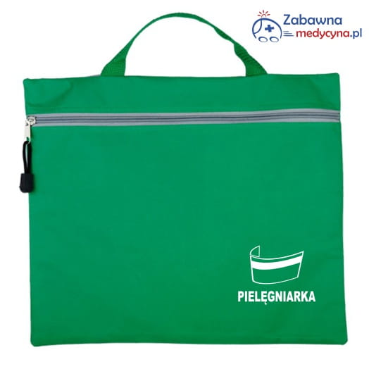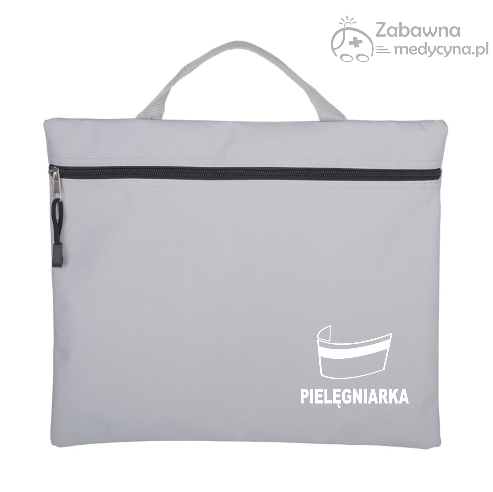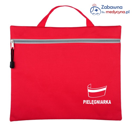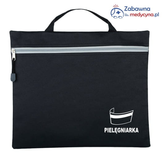 Torba zapinana na zamek z nadrukiem dla pielęgniarki. Nadruk wysokiej jakości w postaci czepka i napisu pielęgniarka. Torba posiada uchwyt, co ułatwia nam przenoszenie ważnych dokumentów czy broszur np. do pacjenta.