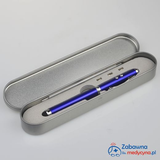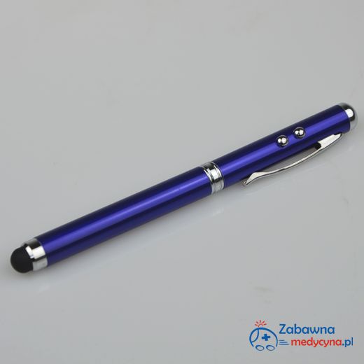 Wielofunkcyjny, metalowy wskaźnik laserowy. Oprócz funkcji wskaźnika, posiada też latarkę LED oraz końcówkę przystosowaną do obsługi ekranów dotykowych. Zapakowany w porządne, metalowe etui. Praktyczny prezent gotowy :)