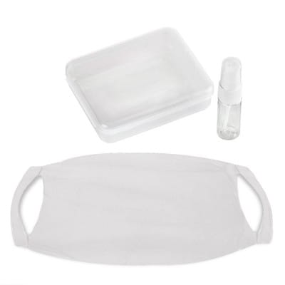 Zestaw Anty COVID-19 składający się z trzech elementów: maseczki higienicznej, butelki na płyn do dezynfekcji oraz pojemnika na maseczkę.